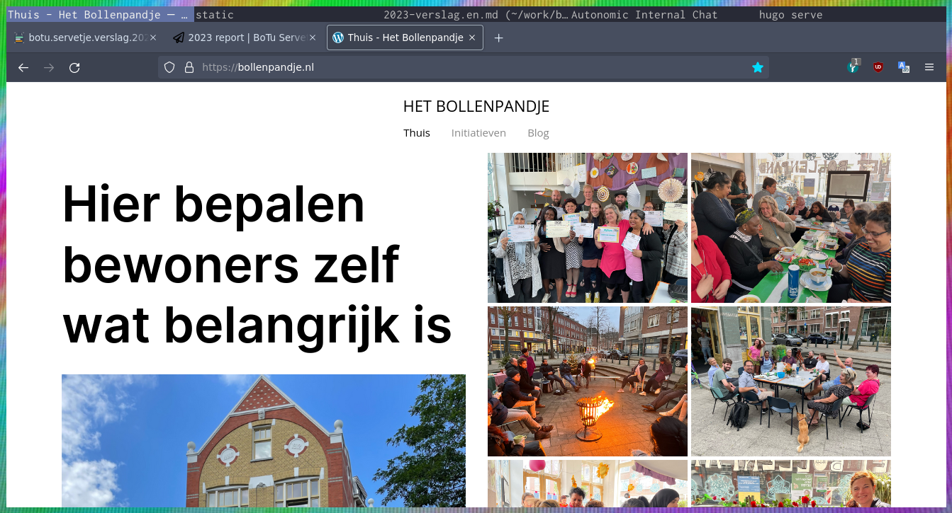 We zijn van plan ook deze website vanuit het Bollenpandje zelf fysiek te hosten en op hun eigen server te hebben natuurlijk 🙃 Het is voor ons vooral belangrijk dat een server als begrip niet heel abstract en onbereikbaar blijft. We kunnen niet alles deze periode maar we richten ons momenteel in op bewustwording creëren.