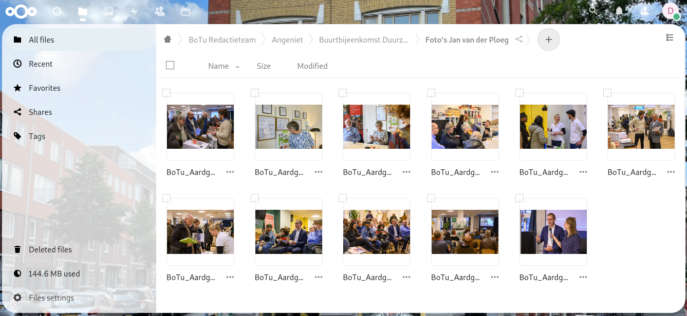 Als een test en eerste stap hebben we een Nextcloud opgezet op de Mathenesserweg server en zijn we fotos en videos daar aan het uploaden. Wat mooi is, is dat alle gebruikerdata blijft vast zitten in deze buurt 😎